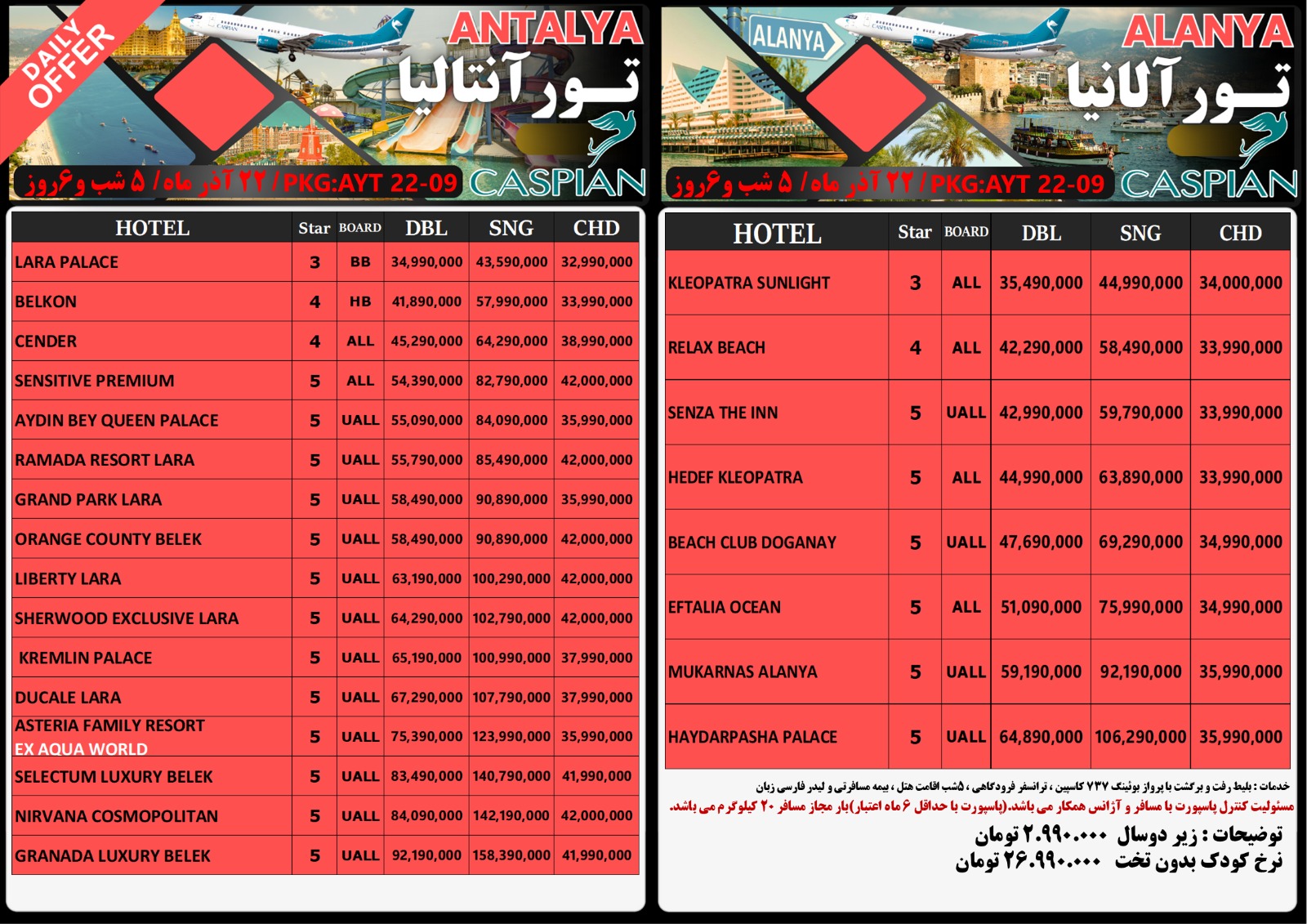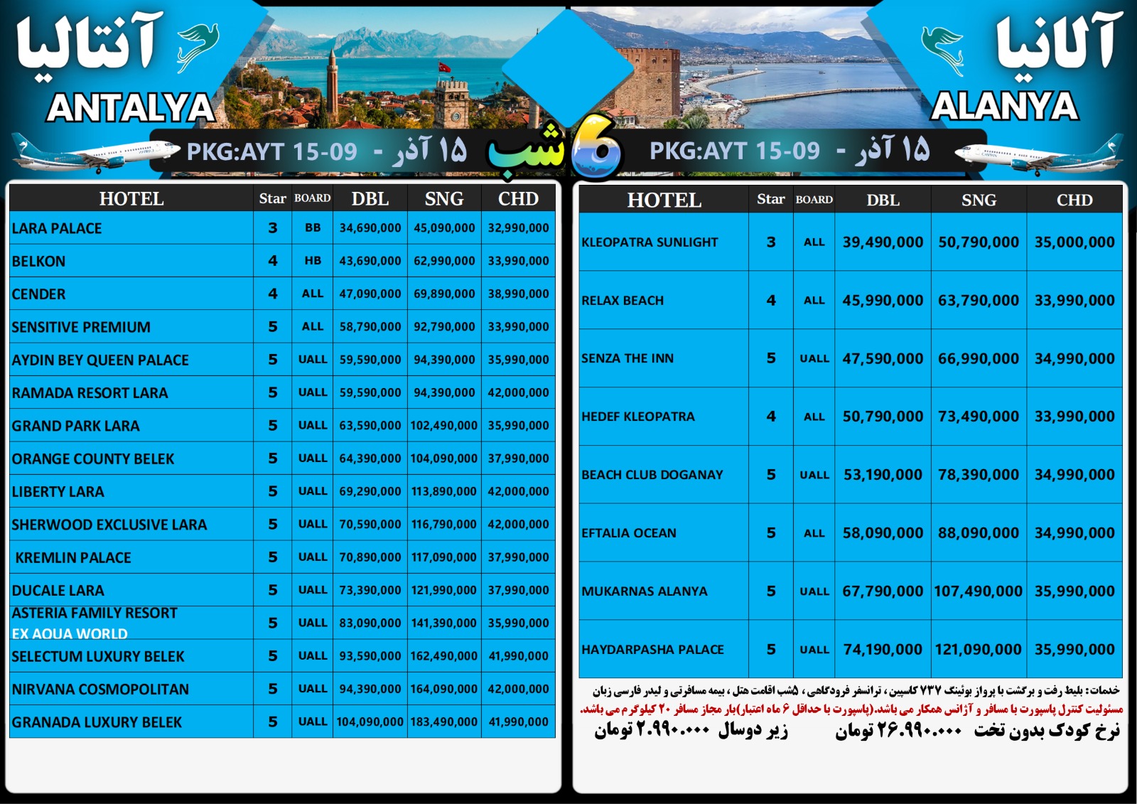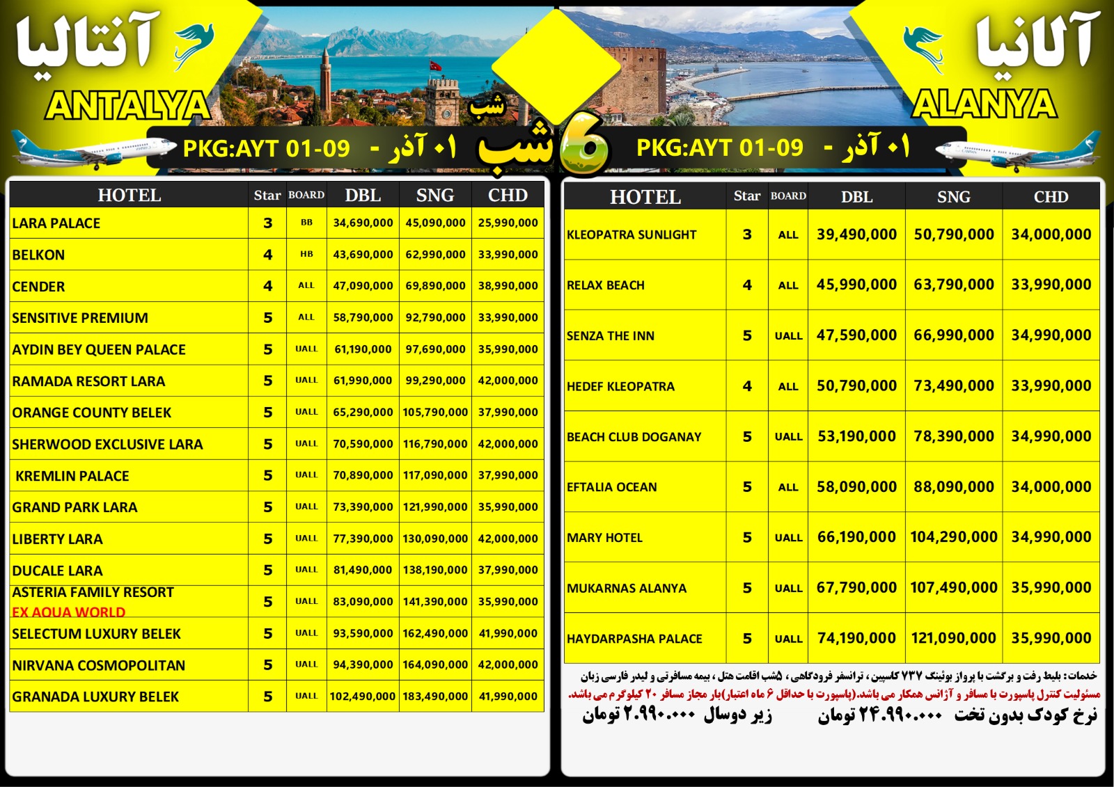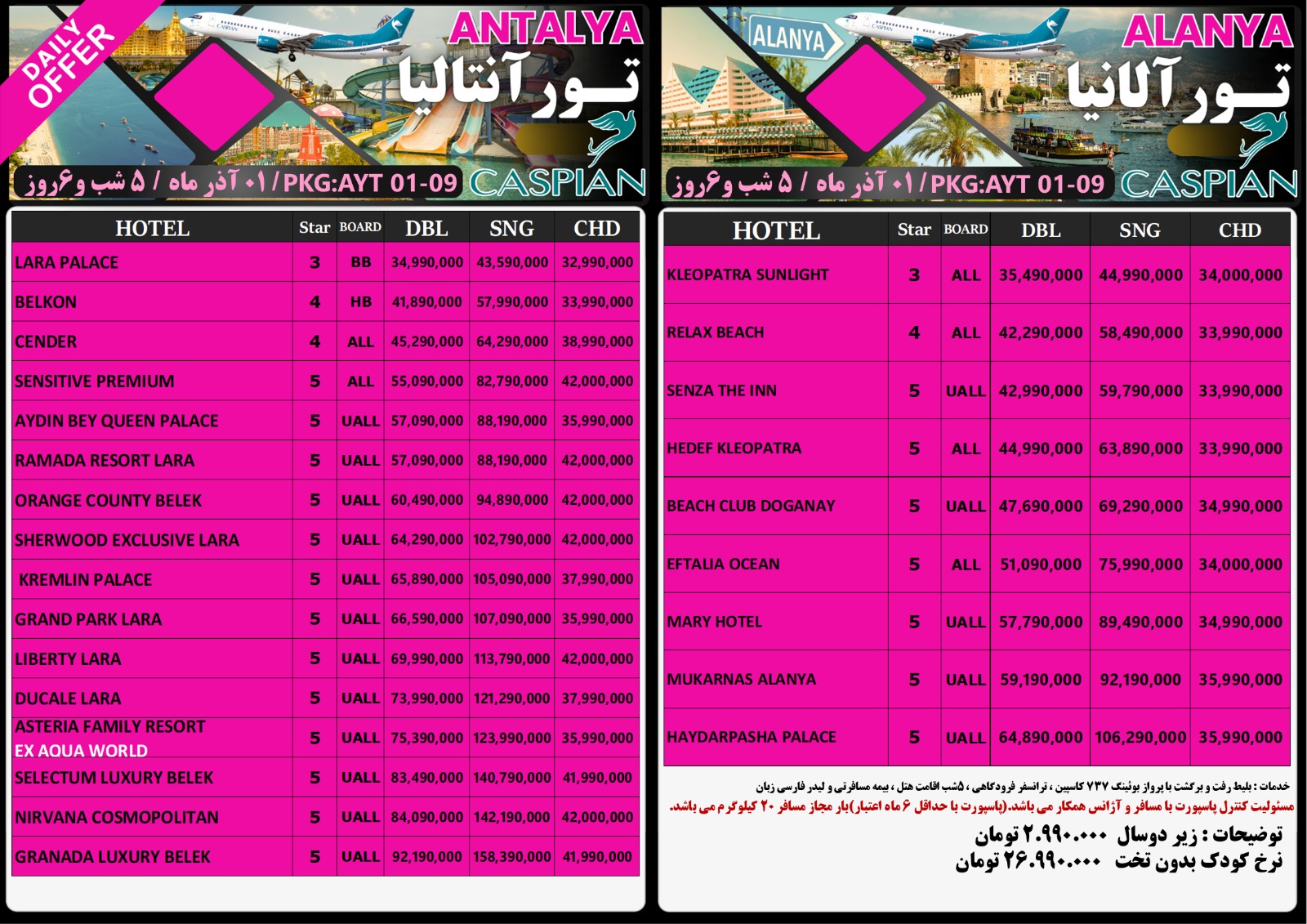 تجربه‌ای بی‌نظیر از سفری لوکس که تمامی خواسته‌های شما را برآورده می‌کند؛ اقامت در مجلل‌ترین هتل‌ها، برنامه‌ریزی حرفه‌ای برای گشت‌های خاص و خاطره‌انگیز، خدماتی منحصر‌به‌فرد و متفاوت، همگی با بهترین قیمت‌ها در انتظار شماست. سفری برنامه‌ریزی‌شده برای خلق لحظاتی ناب و فراموش‌نشدنی!